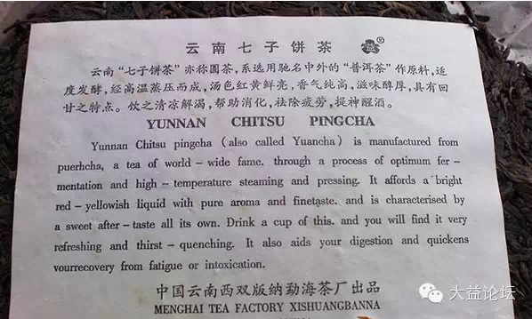 至于仿制:是一群不懂勐海茶厂暗记的小厂做的,这比较容易分别,网络发达,今年亦见有记号的仿品,由于以前勐海茶厂用“凸板印刷”,而现时用电脑印,明眼人一看就知。例2002年茶王青饼,以前仿品中间白菜无四点,而这个有了!!!最后真品。