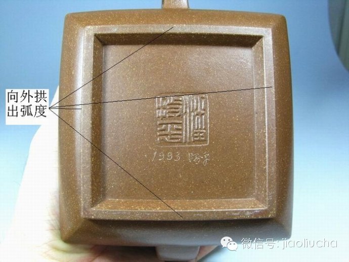 就算我们从正面看到的是纯粹的直线,就算作者制作的壶是纯粹的方货。当我们(微信号jiaoliucha)近距离的观察的时候就会发现,其实远观的直线,近看都是向外鼓出的弧线。
