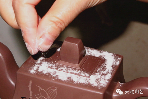 嵌盖的茶壶需要在壶盖与壶身缝隙处撒上这种白色的砂子,防止烧成后粘连在一起。